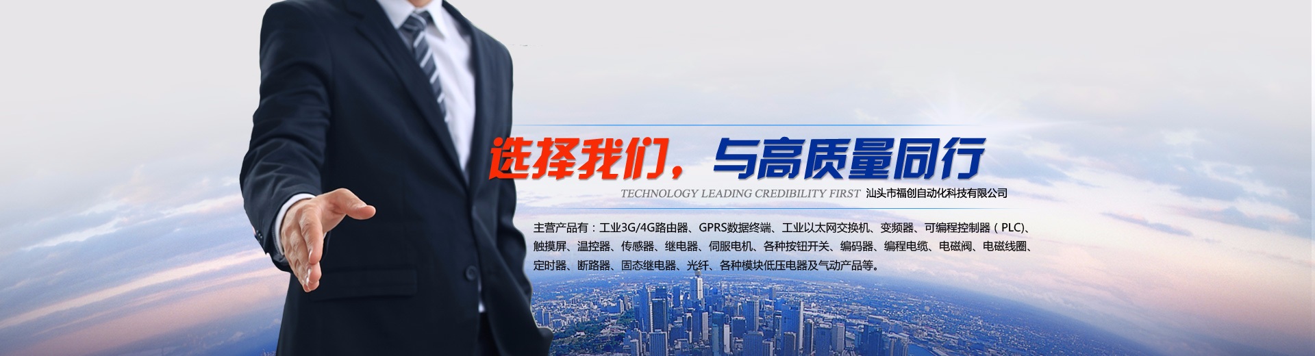 汕頭市福創(chuàng)自動(dòng)化科技有限公司是一家集自動(dòng)化元件的代理銷售與維修、自動(dòng)化設(shè)備設(shè)計(jì)制造、自動(dòng)化工程安裝改造、機(jī)電工程安裝改造、自動(dòng)化機(jī)械設(shè)備設(shè)計(jì)與制造的企業(yè)。  主營(yíng)產(chǎn)品有:工業(yè)3G/4G路由器、GPRS數(shù)據(jù)終端、工業(yè)以太網(wǎng)交換機(jī)、變頻器、可編程控制器(PLC)、觸摸屏、溫控器、傳感器、繼電器、伺服電機(jī)、各種按鈕開關(guān)、編碼器、編程電纜、電磁閥、電磁線圈、定時(shí)器、斷路器、固態(tài)繼電器、光纖、各種模塊低壓電器及氣動(dòng)產(chǎn)品等。